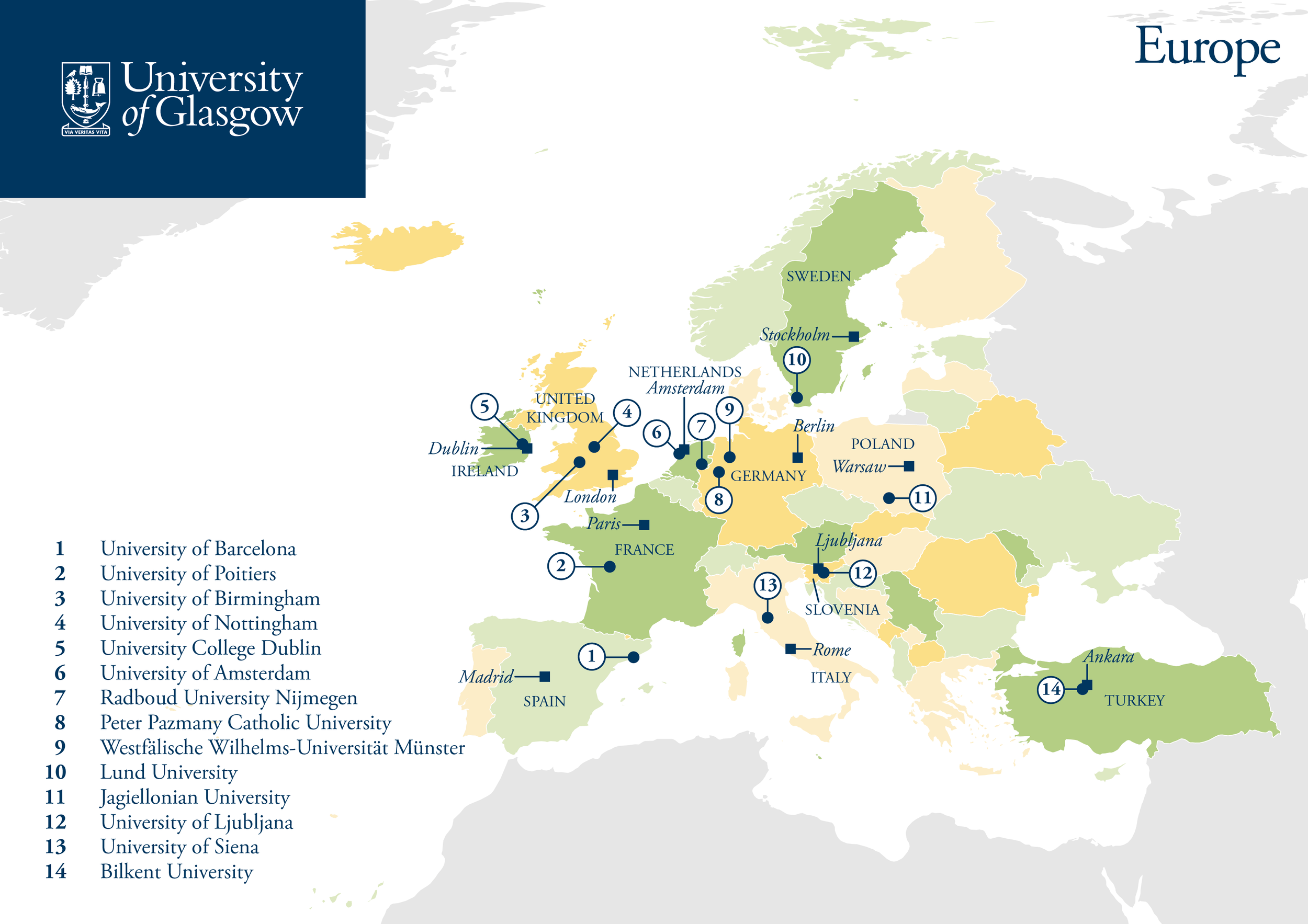 I was approached by the Vice-Principal of International Engagement at the University of Glasgow to produce a series of maps for use in communications and presentations that clearly displayed and listed all the university’s academic partnerships. Stylistically there were strict requirements to implement the university’s brand guidelines.