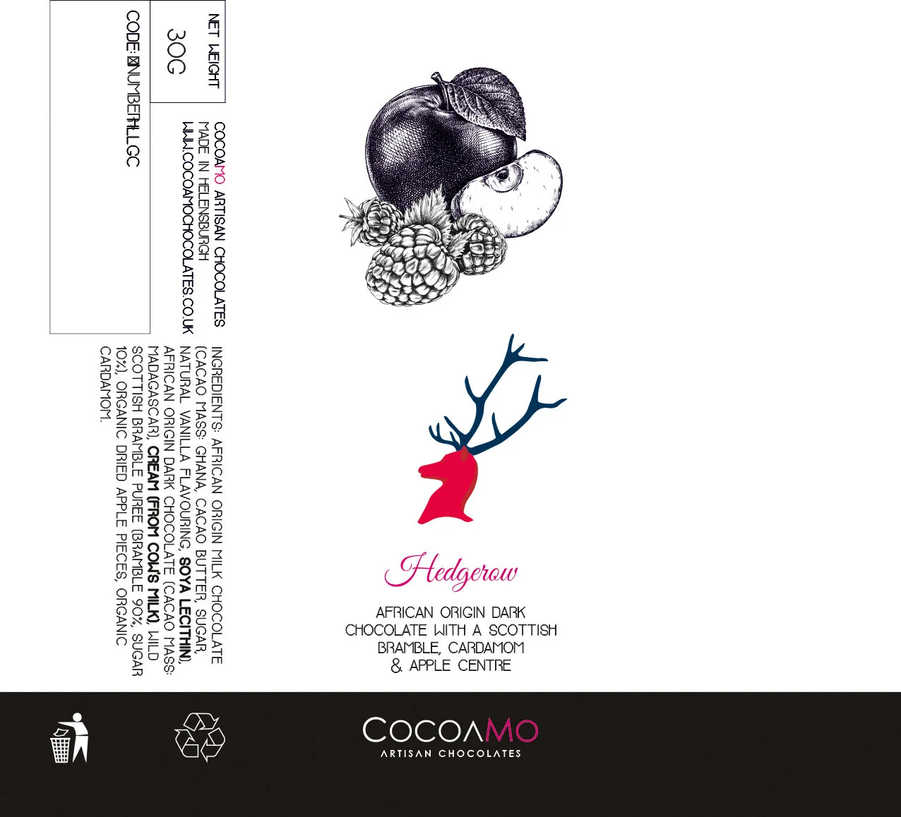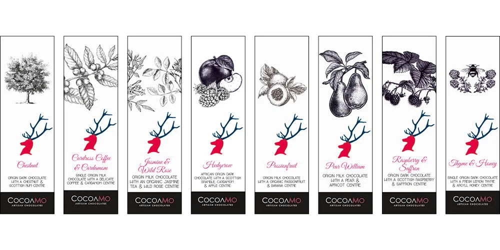 As a boutique chocolatier producing small-runs with a focus on seasonal and local ingredients. My task was to redesign their packaging to focus on up-market appeal, with only the brand logo carried over from their old designs. As such, we stripped back the design to classically themed botanical images and black and white photography, extracting the magenta from the logo as a highlight colour across the range.